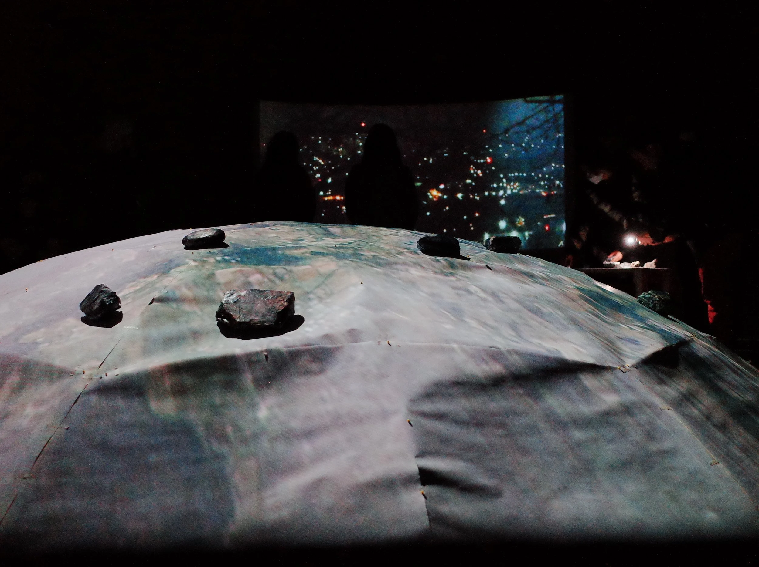 A site-specific, multi-channel video installation at the Rubinstein Arts Center, at Duke University. Centered in the Murthy Agora Gallery and emanating through the building’s hallways and interstitial spaces, it included 10 videos displayed on concentric curved screens centered around a dome. Each screen showed a continuous view of the earth from different vantage points and different scales. The central dome showed a satellite's view of eastern Europe, in a transit above the former Pale of Settlement (Ukraine, Belarus, and Poland). Other screens show the horizon from Montclair, NJ, insects of North Carolina, and Google Earth flight simulations across eastern Europe.
